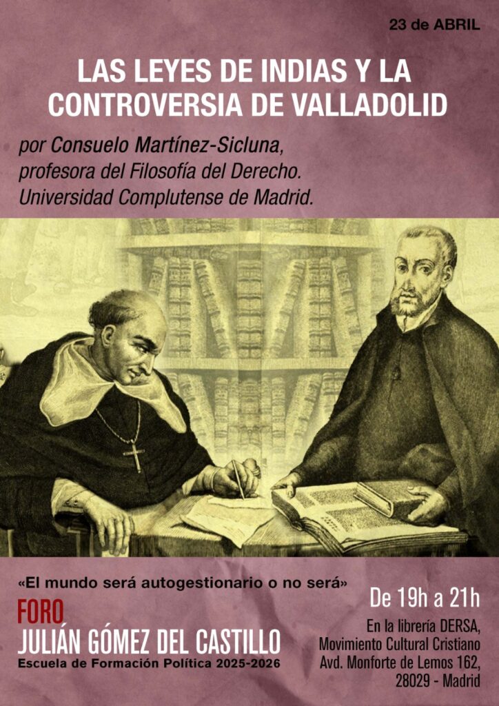formación política Las leyes de Indias y la controversia de Valladolid abril 20, 2026 admin por Consuelo Martínez-Sicluna, profesora de Filosofía del Derecho de la Universidad Complutense de Madrid Tu nombre Tu correo electrónico A qué actividad te deseas inscribir Motivación (opcional)